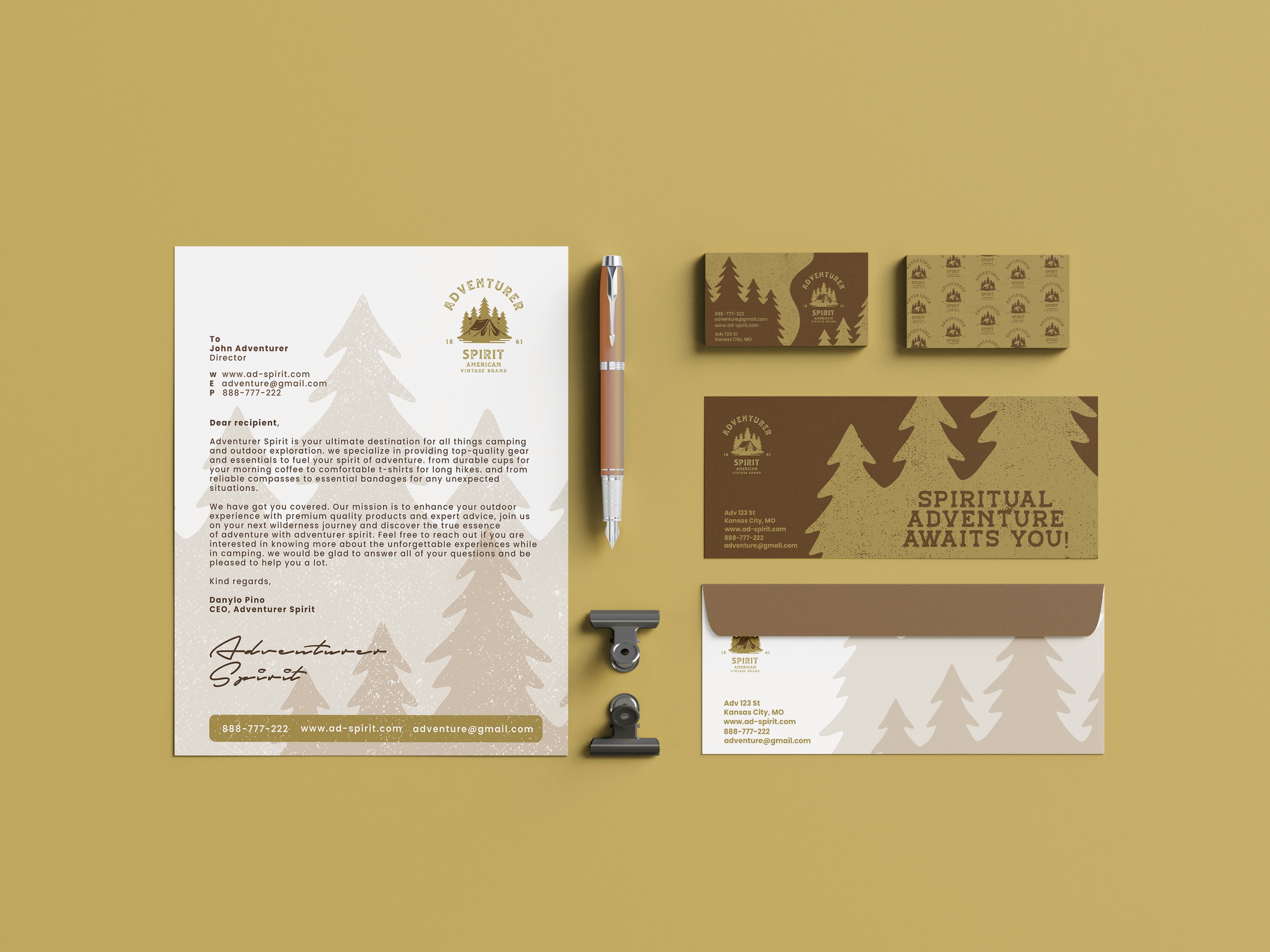 The brand identity elevates the Adventurer Spirit camping brand, embracing the authentic culture of camping while fostering a deep connection with outdoor enthusiasts. It presents a rugged yet refined image that resonates with those who value exploration, adventure, and the great outdoors, helping to build a lasting sense of community and trust within the camping culture.