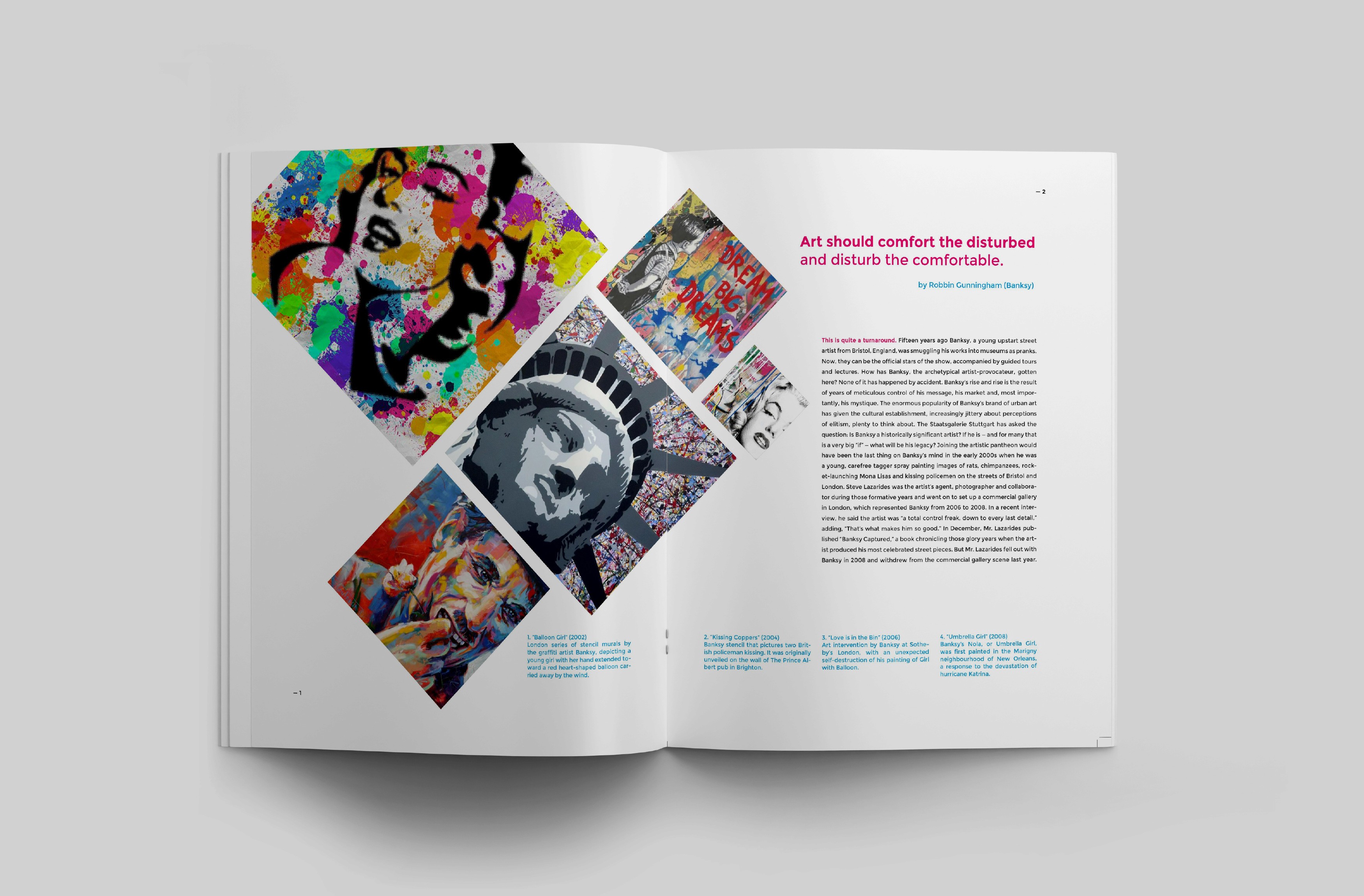 Then, I ventured into the world of street art with Banksy. This spread was a bit of an enigma, just like the artist himself, with bold, eye-catching visuals that made you stop and think. Banksy’s work is all about making a statement, and I wanted the layout to do the same—powerful and striking, with an undercurrent of mystery.